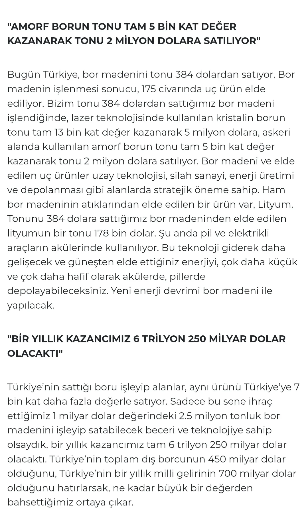 Bor madeni ihraç etmiyoruz demedim. Biz bor madeni ihraç ediyoruz adamlar da işleyip bize çok daha pahalıya satıyor. Direk bor madeni almıyoruz zaten.
