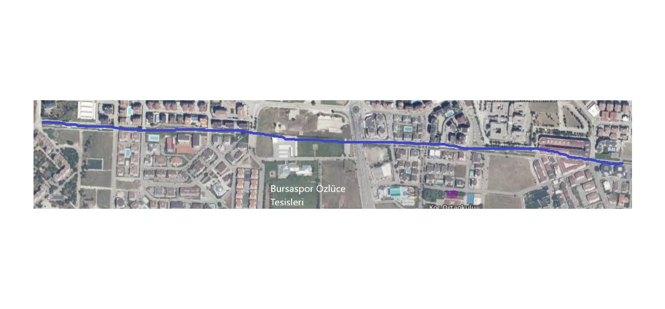 29 Ekim ve Yüzüncüyıl Mahallesinde mavi ile çizdiğim Nato boru hatttının güzergahı. Bursaspor Özlüce tesislerinin içinden de geçiyor. Üzeri yürüme yolu. Sağından solundan 10 mt reye kadar siteler var. Nato petrol hattı koruma mesafesini 10 mt olarak değerlendirmek lazım.