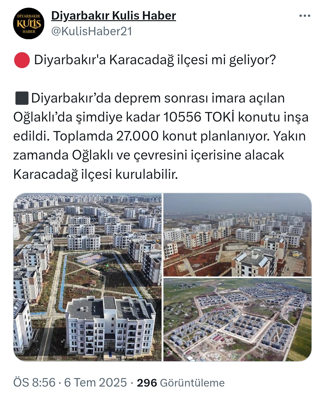 ilçenin adı Karacadağ olacak Oğlaklımı Merkezi olacak?Peki siz hiç 27000 konut + ilk evim ile nereden baksanız 5000 konut yapilan bir yer gördünüz mü? 32 bin konut tamamlanınca 100 bin nüfus yapar bu bir il olma kriteri