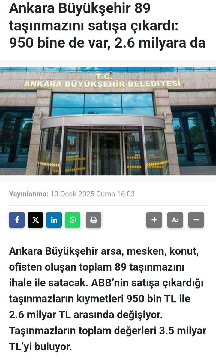 Biran önce satsın da Ankara'ya yakışan yeni otobüsleri alsın.ABB, (BELEDİYEYE ait) haftaya en az 3,5 milyarlık arazi, konut ve iş yeri satacak. Otobüs alımı sayısı artabilir.