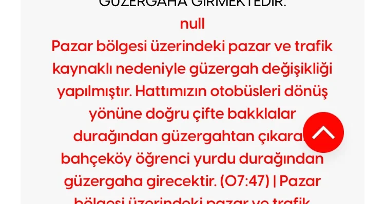 Yoğun Trafik nedeniyle araçlarımız seferlerine 15 dakika ve üzeri rötarlı hareket etmektedir. (16:48) KARTAL METRO durağından başlayacak 18:15 seferi 15 dk. geç hareket edecek şekilde düzenlenmiştir. | KARTAL METRO durağından hareket eden 17:00 seferi 21 dk. geç, 17:25 seferi 11 dk. geç başlamıştır.