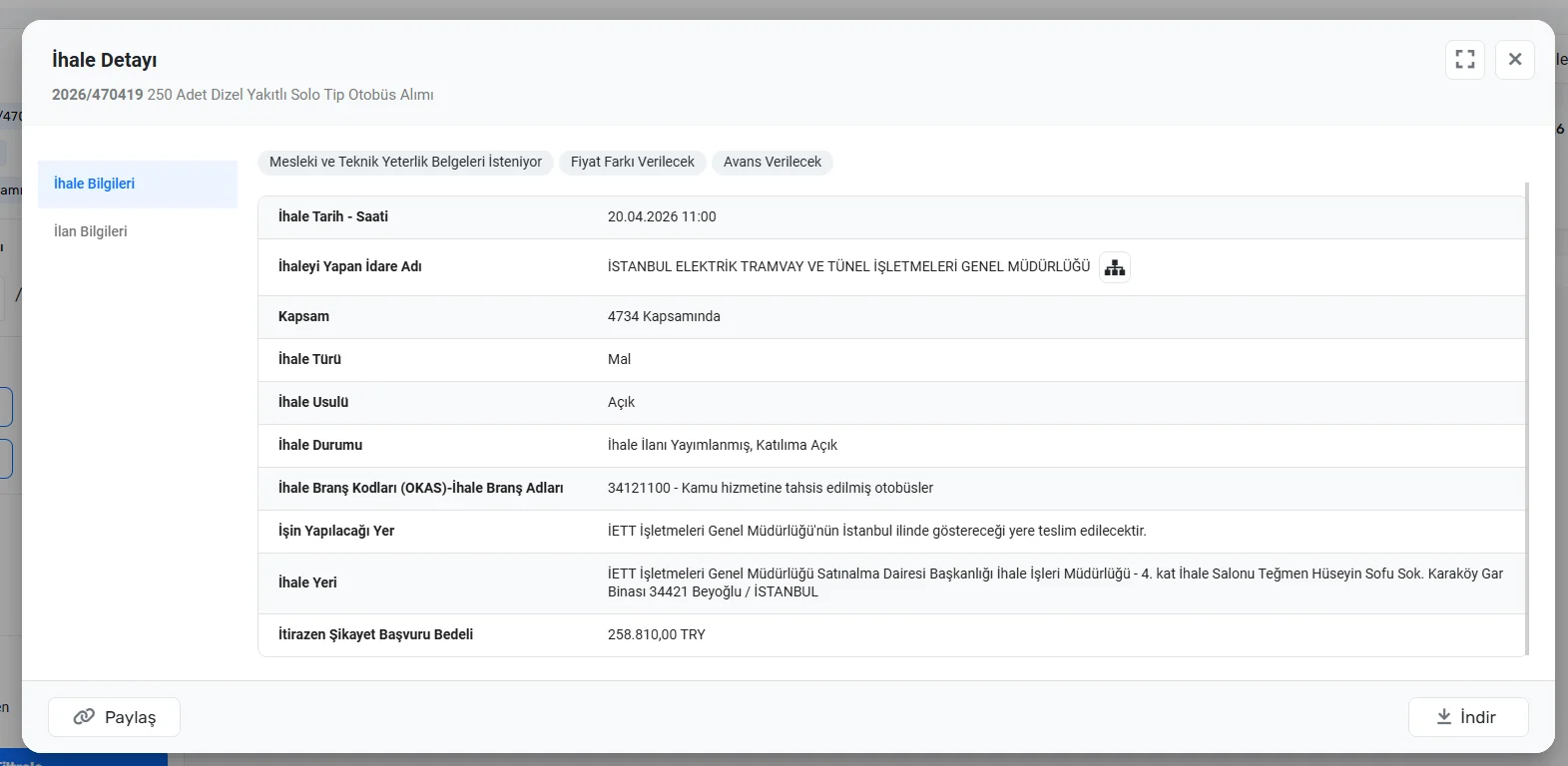 İhale 20 Nisan 2026 11:00'de (İhale numarası: 2026/470419)