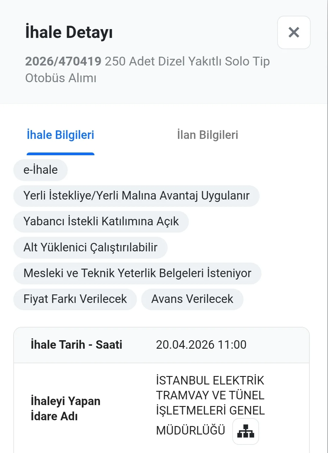 "2023/253223 120 Adet Dizel Yakıtlı Solo Tip Otobüs İhalesi.Mercedes Firması 20 Senedir Yapılan İett,nin Solo Otobüs İhalelerine Katılmadı.Körüklü İhalelerine Giriyordu Hep.2016 da Yapılan İhale dede Yoktu. Akia Konusundada Sana Katılıyorum Zaten O Firmaya Verilmek İçin Yapıldı.
