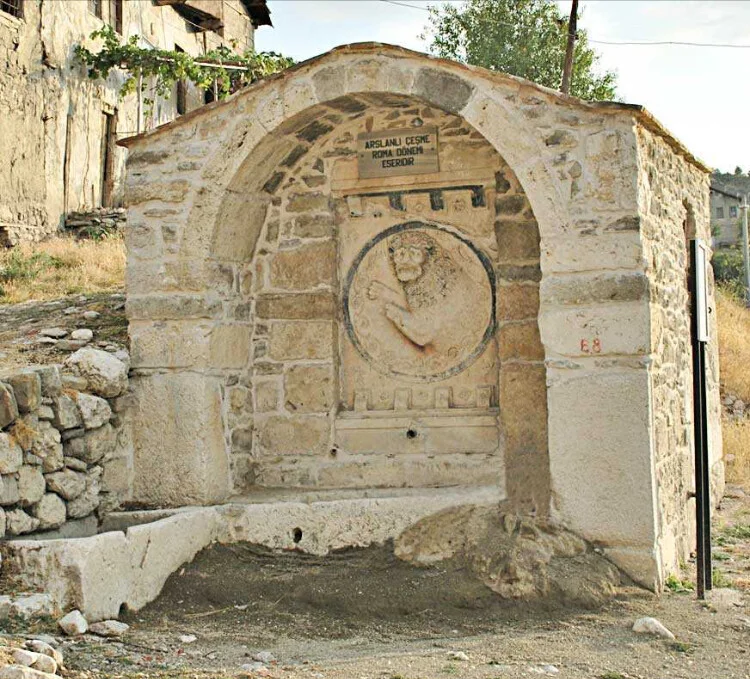 Eski Kasaba’da bulunan dikdörtgen bir yapıdır. Yuvarlak kemerli ve beşik çatılıdır. Temelde blok taşlar kullanılmıştır. Kemer içinde Roma mimarisi süsleme elemanı aslan kabartmalı bir blok vardır. Bu yüzden çeşmeye Aslanlı Çeşme denmiştir.
