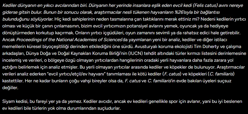 Takmışsın araştırın geline , araştırıyorum kedi evcil olanı da var yabani olanı da var bu hayvanlar avcı hayvanlar sokakta yaşamaları çok doğal ne gibi bi felakete yol açıyorlar onu da anlanadımOkudukça gülüyorum. Yazdıklarının tamamı şehir efsanesi. Bir araştırın gelin lütfen. Hepinize saygı duyuyorum. Sen hakaret etsen de bak cevap yazıyorum. Gerçeklerden kaçmayın. Hepinizin araştıracak kapasitesi var. Tek tek hepsine cevap vermek istemiyorum. Hiçbir medeni/gelişmiş ülkede böyle bir saçmalığa artık izin verilmemesinden bir çıkarım yapabilirsiniz.