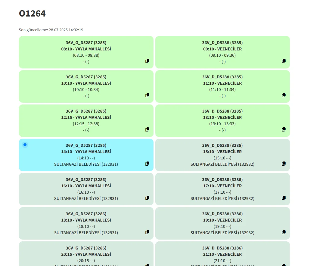 @Semih19-2 Hiç merak edip bakmamıştım bugün merak edip baktım. Bu hat niye bu kadar hızlı kısa bitiyor. ortalama 23-30 dk sürmüş neredeyse hepsi. Hatta hiçbir sefer 30 dk bile sürmemiş. Arttırım talebinde haklısın. Çünkü sefer 23 dk sürüyor 30 dkdan fazla dinlenme yapıyor. Mesela en son sefer 23 dk sürmüş 37 dk dinlenmiş. Bunu yazarken 14:10'da 14:35'te bitmiş 25 dk sürmüş. 35 dk dinlenme.