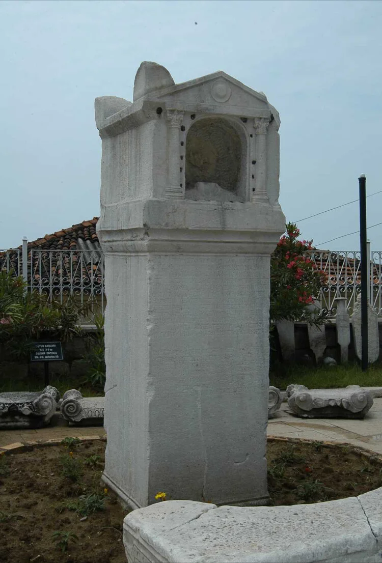 Karadeniz Ereğli’de gösteriler yapan ve orada ölen eski Mısırlı pandomim sanatçısı Krispos’un anısına yapılmıştır. Kaidesi ile birlikte 2.10 metre yükseklikte bulunan anıtın önünde 19 satırdan oluşan ve kazılarak yazılmış bir şiir bulunmaktadır. Anıt, yüksek bir kaide üzerinde oturtulmuş iki korint başlıklı sütun, sütunların arasında içinde başsız bir büstün bulunduğu oyuk ve üçgen çatı olarak tasarlanmış taç kısmından oluşmaktadır.