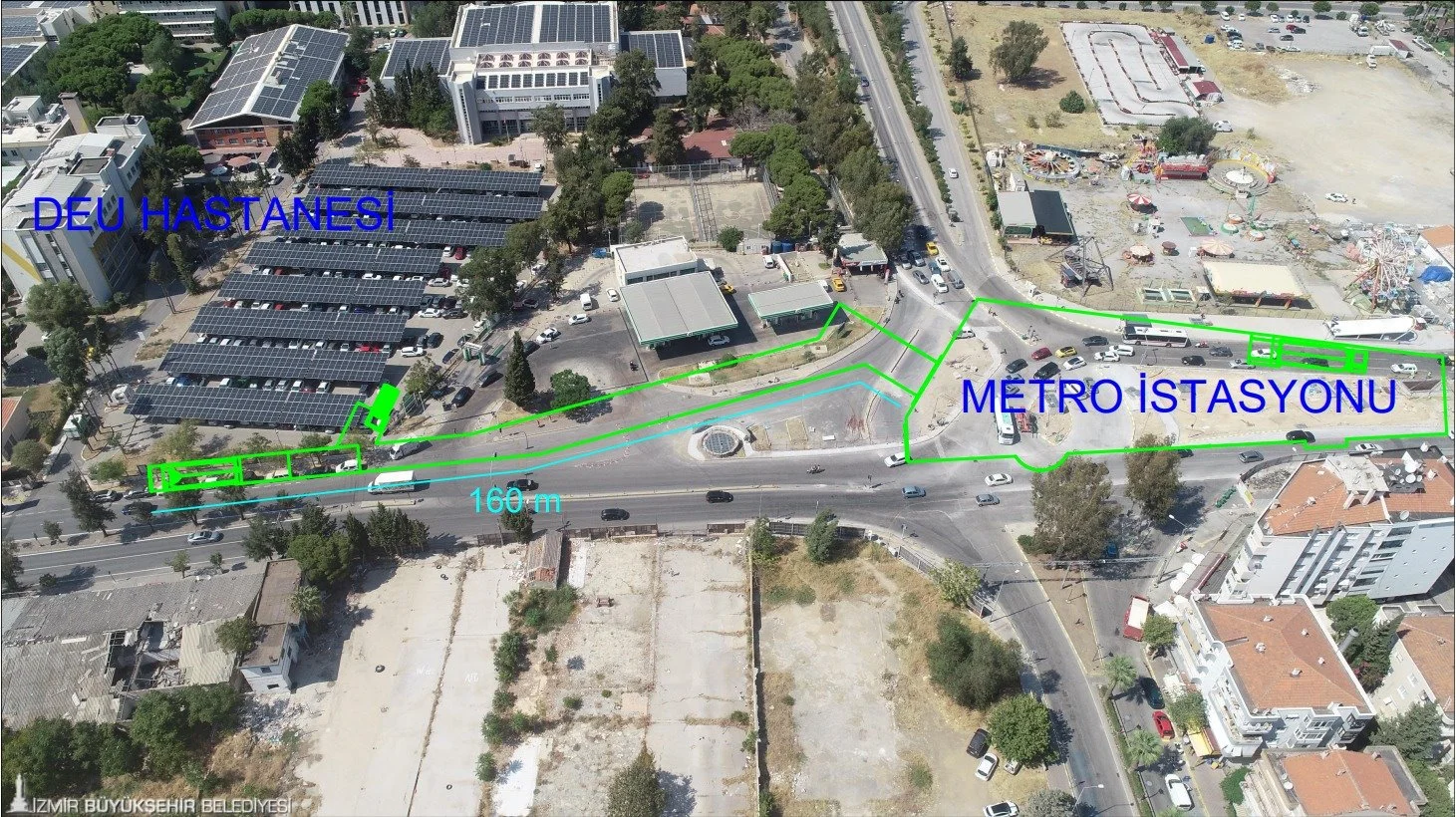 İzmir Büyükşehir Belediyesi, araç ve yaya trafiğinin yoğun olduğu İzmir Metrosu’nun Dokuz Eylül Üniversitesi Hastanesi İstasyonu çıkışını yeniden düzenliyor. Güvenli ve konforlu ulaşım için yurttaşlardan gelen talepler üzerine harekete geçen Büyükşehir, istasyon çıkışı ile hastane arasında 160 metrelik yaya tüneli yapacak.