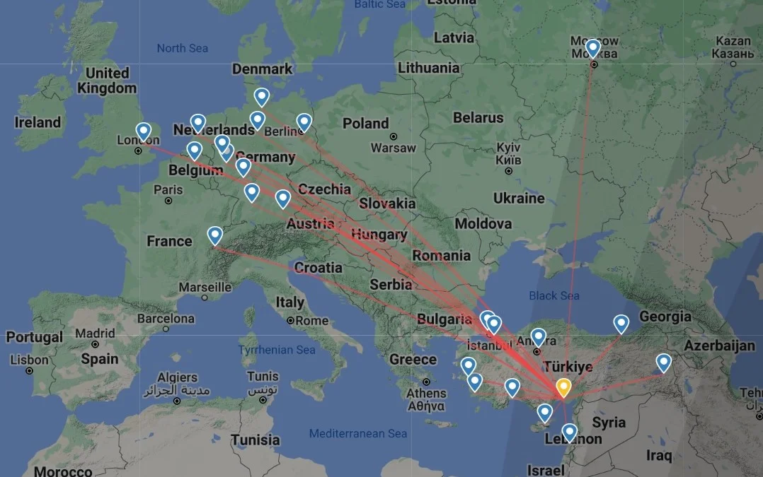Lübnan’da Beyrut, Suudi Arabistan’da Cidde, İran’da İse Tahran’a direkt seferler oluyor ama haritada 1 haftalık rotalar olduğu için Cidde ve Tahran görünmüyor.