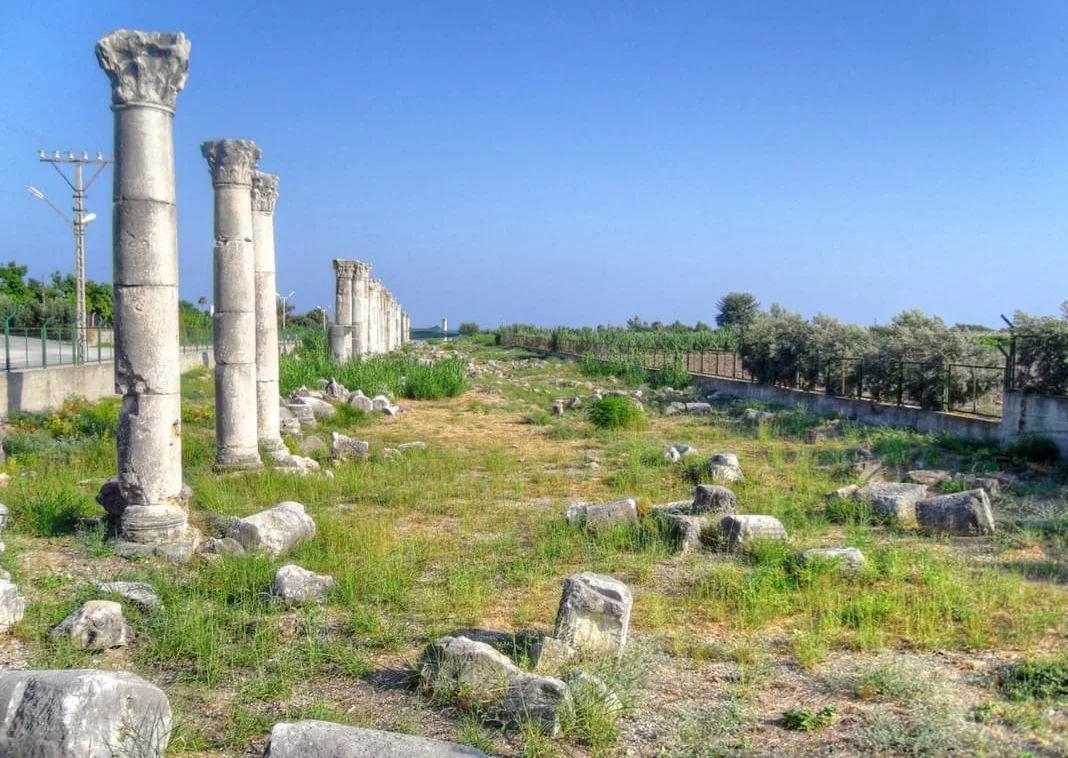 Antik Liman: Kalıntılarının bir bölümü bugün de görülebilen liman, birbirinden 200 metre aralıklarla düzenlenmiş iki dalgakırandan oluşmaktadır. Bunlardan batıdaki daha iyi korunmuştur. Büyük kalker blokların, demir perçinlerle tutturulduklarını gösteren izler halen görülebilmektedir. Batıdaki dalgakıranın batısı kum yığıntısı ile dolmuştur. Yapılan ölçümlere göre korunmuş olan uzunluğu 160 metre, eni ise 23 metredir. Yapı malzemesi olarak kullanılan kalker taşların yaklaşık olarak uzunluğu 160 santim, eni 60 santim ve derinliği 60 santimdir. Doğudaki dalgakıranın çok azı kaldığı için ancak 40 metre kadarı ölçülebilmiştir. Antik Dönem’e ait liman kalıntısı gözle görülebilen ender ören yerlerinden birisidir. Çünkü bu bölgedeki limanlar daha çok doğal konumları itibarı ile kullanılmışlardır.