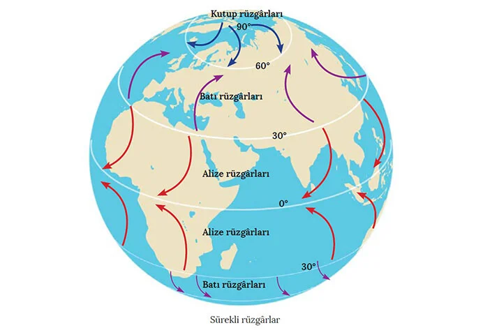 • Alizeler: Tropiklerin yakınında, kuzeydoğudan güneybatıya doğru esen sürekli rüzgarlardır.