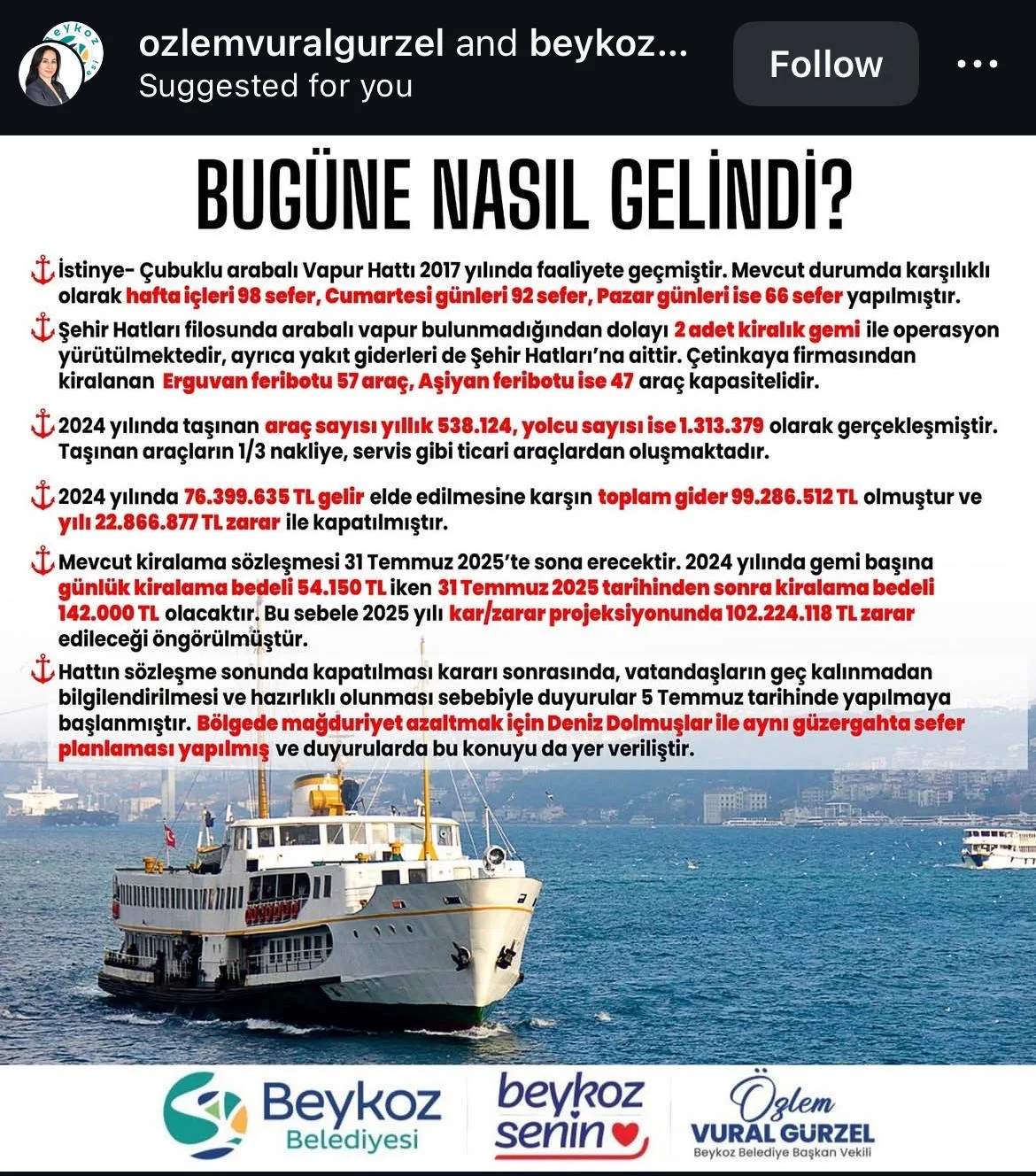 İBB iştiraki Şehir Hatları, 31 Temmuz 2025 itibarıyla İstinye–Çubuklu arabalı vapur hattının hizmet vermeyeceğini duyurdu. Yapılan açıklamada, aynı güzergâhta yolcu taşımacılığına özel olarak deniz dolmuş seferlerinin başlayacağı belirtildi. Açıklama şöyle oldu: