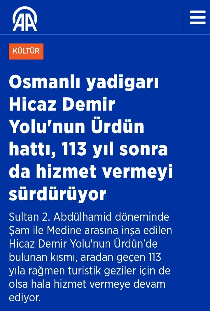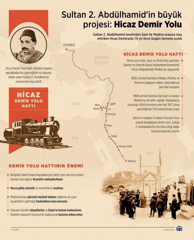 120 yıllık proje Bu sefer Türkiye ve Suriye ile beraber tekrar yapılmalı. Dediğiniz gibi ticareti arttırır ulaşımı rahatlatır.120 yıllık bu projenin şu an aktif olduğunu düşünün. Ticareti artırır, ulaşımı rahatlatır. Böyle büyük bir proje. Vaktinde Hac mesafesini 1 aydan 5 güne indiren bir proje.
