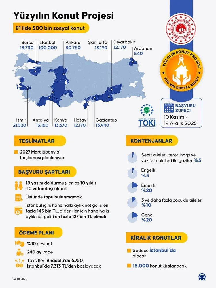Sloganı "Ev Sahibi Türkiye" olarak belirlenen "Yüzyılın Konut Projesi" kapsamında 81 ilde 500 bin sosyal konut inşa edilmesi planlanıyor.